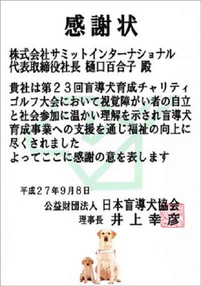 サミットインターナショナルは、平成27年9月8日 厚木国際カントリー倶楽部において開催された、第23回 盲導犬育成チャリティゴルフ大会の協賛企業に。盲導犬協会から感謝状が贈られました