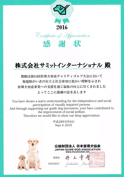 サミットインターナショナルは、平成28年9月6日 厚木国際カントリー倶楽部において開催された、第24回 盲導犬育成チャリティゴルフ大会の協賛企業に。盲導犬協会から感謝状が贈られました。
