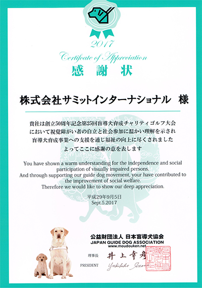 サミットインターナショナルは、平成29年9月5日 厚木国際カントリー倶楽部において開催された、第25回 盲導犬育成チャリティゴルフ大会の協賛企業に。盲導犬協会から感謝状が贈られました。