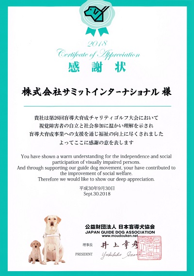 サミットインターナショナルは、平成30年9月4日 厚木国際カントリー倶楽部において開催された、第26回 盲導犬育成チャリティゴルフ大会の協賛企業に。盲導犬協会から感謝状が贈られました。