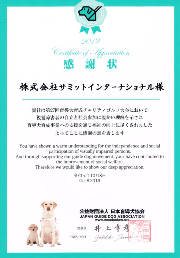サミットインターナショナルは、令和元年10月8日 厚木国際カントリー倶楽部において開催された、第27回 盲導犬育成チャリティゴルフ大会の協賛企業に。盲導犬協会から感謝状が贈られました。