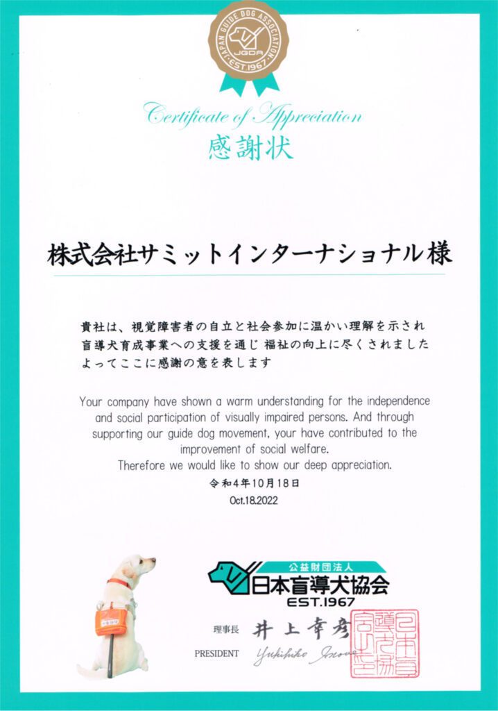 ㈱サミットインターナショナルは盲導犬協会へ寄付、応援をつづけ直接感謝状をいただくようになりました。 平成7年から現在まで公益財団法人「日本盲導犬協会」、平成12年〜現在まで公益財団法人「北海道盲導犬協会」を応援させて頂いております。