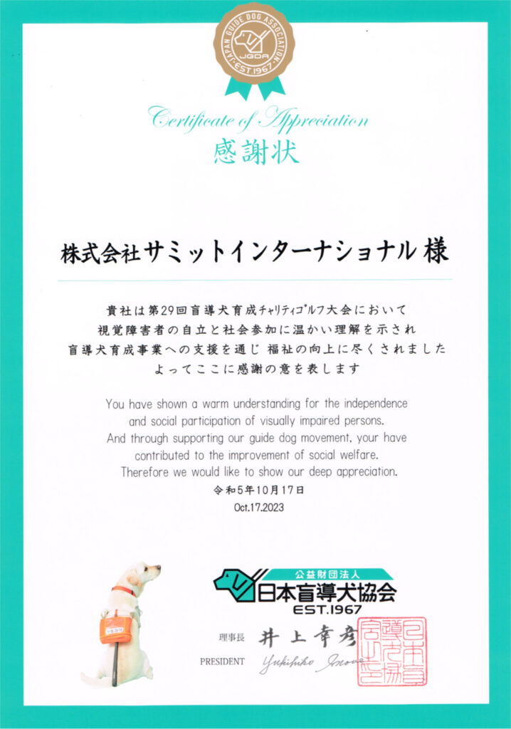 サミットインターナショナルは、令和5年10月17日 厚木国際カントリー倶楽部において開催された、第29回 盲導犬育成チャリティゴルフ大会の協賛企業に。盲導犬協会から感謝状が贈られました。