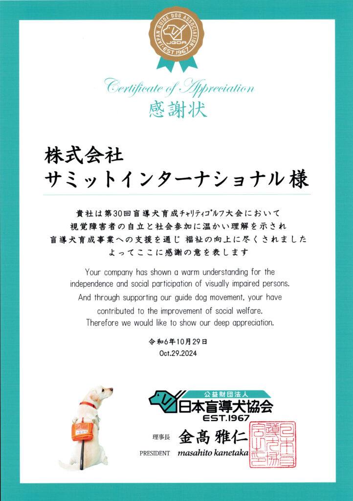 サミットインターナショナルは、令和6年10月29日 厚木国際カントリー倶楽部において開催された、第30回 盲導犬育成チャリティゴルフ大会の協賛企業に。盲導犬協会から感謝状が贈られました。