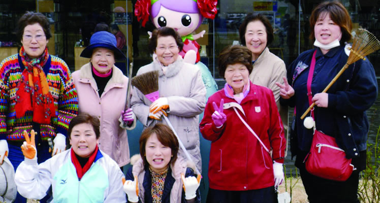セミナーで使用している会場の周りを清掃したのはローズ(松井SAG)さんとファミリーさん。福山市は今年100周年でバラを100万本植えているそう。そのキャラクター、ローズちゃんの前にて記念撮影。