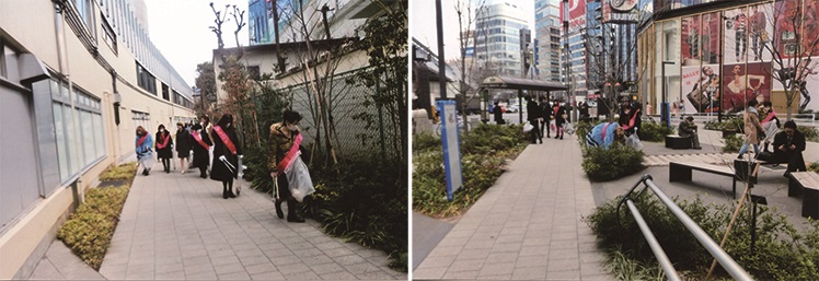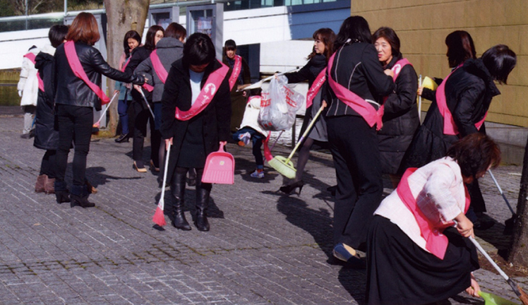 セミナー会場周辺の清掃に励むのは、アンドゥ(保坂SAG)、水信(伊井SAG)、緑の花束(矢口SAG)ファミリーの皆さん。始めた頃からずっと手作りのたすき掛けで一生懸命お掃除をし続けています。
